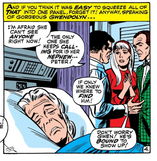 Like Gwen, Harry is worried. In #58 we see him and Gwen are with Aunt May in hospital. She’s so worried about her nephew being kidnapped by Spider-Man it did a number on her nerves.