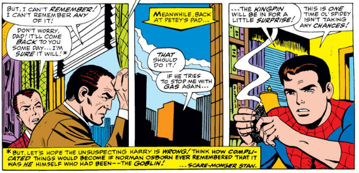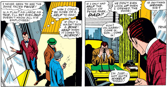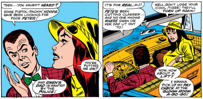 The story so far: Peter was being menaced by the Kingpin’s goons, George Stacy was brainwashed by the aforementioned Kingpin, Gwen was distraught, and MJ had a job working at a club that was secretly a front for the Kingpin’s operations. Here, let Harry fill ya in.