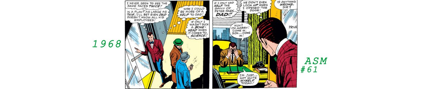 The story so far: Peter was being menaced by the Kingpin’s goons, George Stacy was brainwashed by the aforementioned Kingpin, Gwen was distraught, and MJ had a job working at a club that was secretly a front for the Kingpin’s operations. Here, let Harry fill ya in.