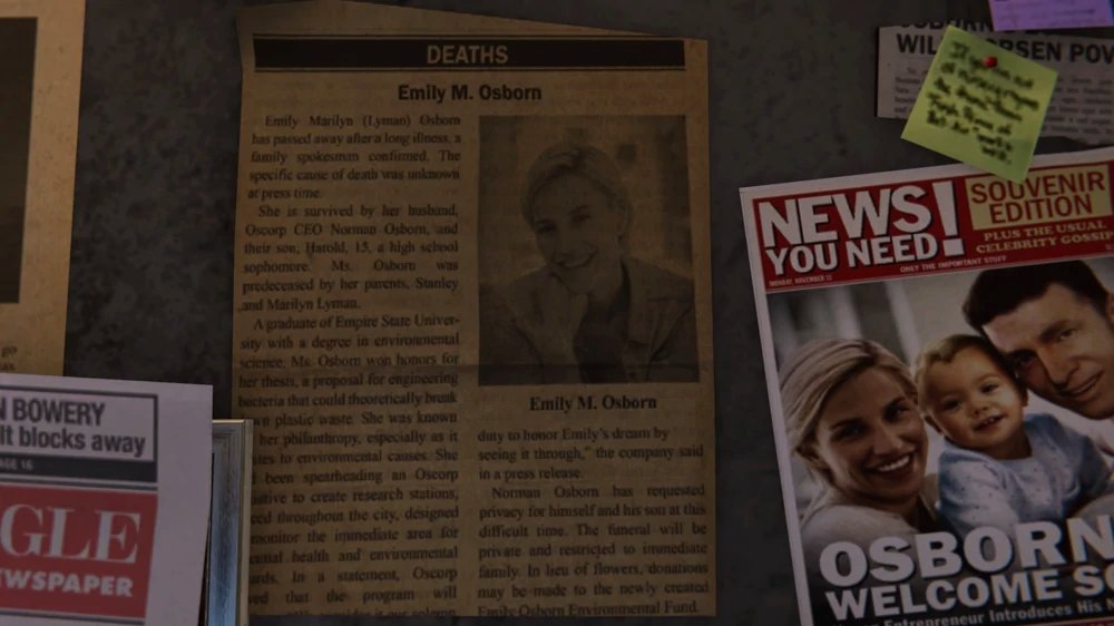 Late on in the game we learn Harry is dying from the same disease that killed his mother. In his journal he left a note for Peter and MJ, and ow my heart again.