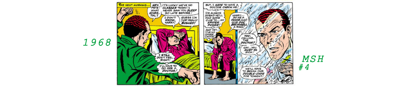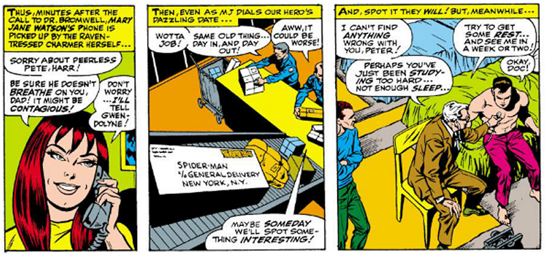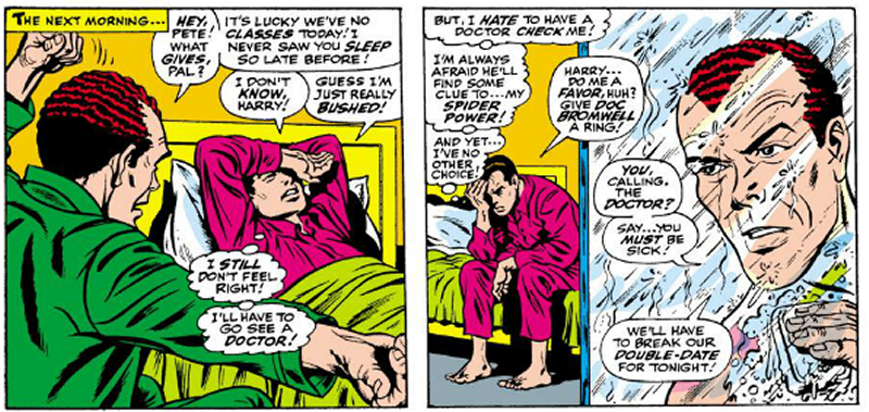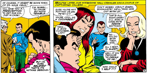 Harry (who is drawn much more well-built in this than he usually is) takes both MJ and Gwen with him to go get Peter’s prescription from the doctor. (I wonder if he paid for it?)