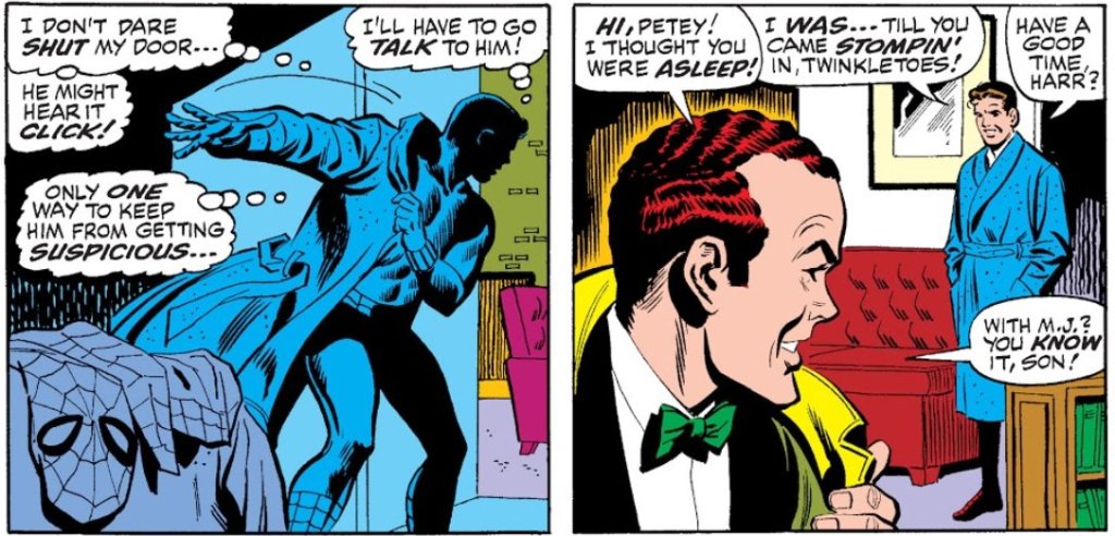 In #71, (the first ASM of 1969) that thing Peter keeps worrying about almost happens, with Harry walking in just as Peter is done spidermanning.
