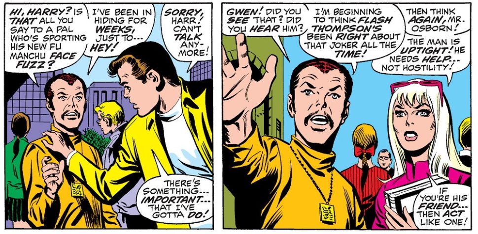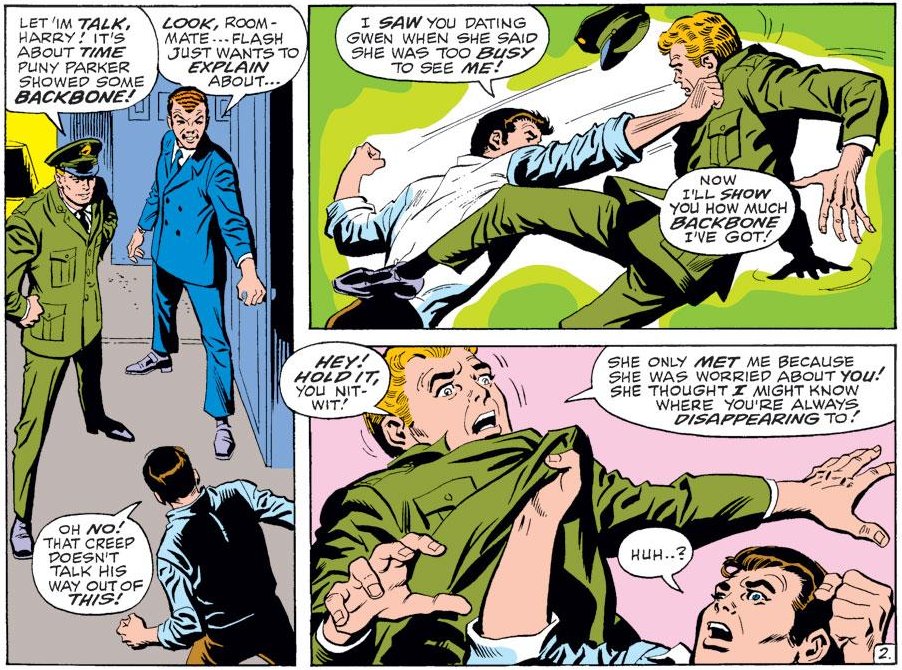 A little later in the issue, Peter remembers that Harry is on a date, presumably with MJ. (Presumably.)