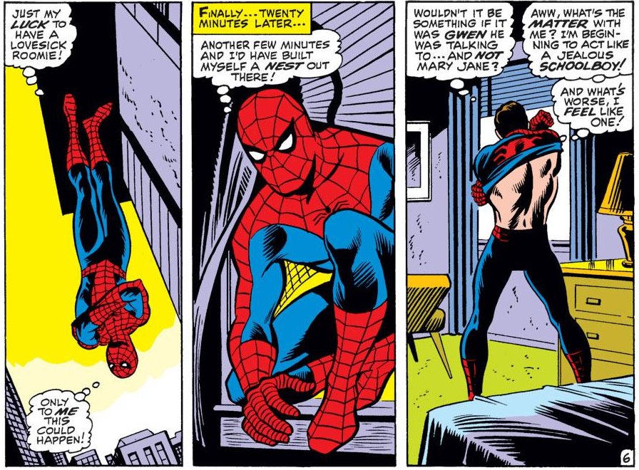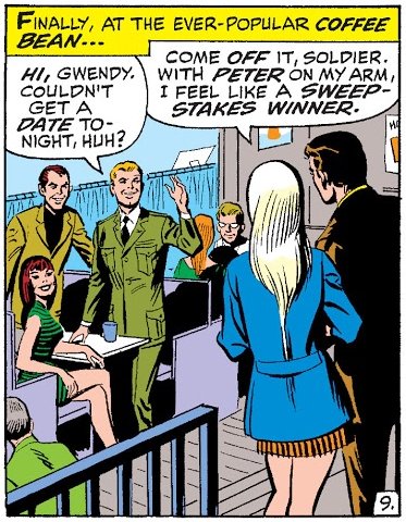 Alas, things are still not all well within the group. As soon as Flash makes a jokey pass at Gwen, Peter gets furious and storms off.