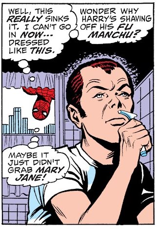 Peter is worrying about Dr Connors and far too busy to focus on a little thing like his friend’s culturally problematic facial hair. (Little history of Fu Manchu for you there.)