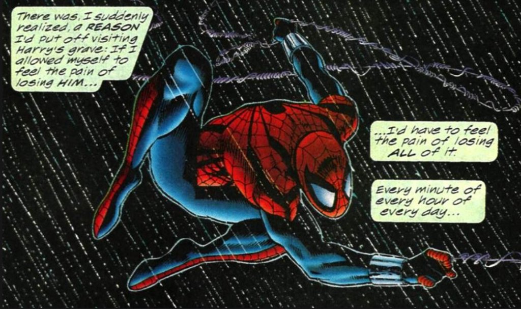 Jump forward a couple of years later, and we have a whole scene of Ben (believing at the time that he’s the original Peter Parker) grieving for Harry in Spider-Man: Redemption #1 (1996). This one was written by – you can probably guess – J.M. Dematteis!