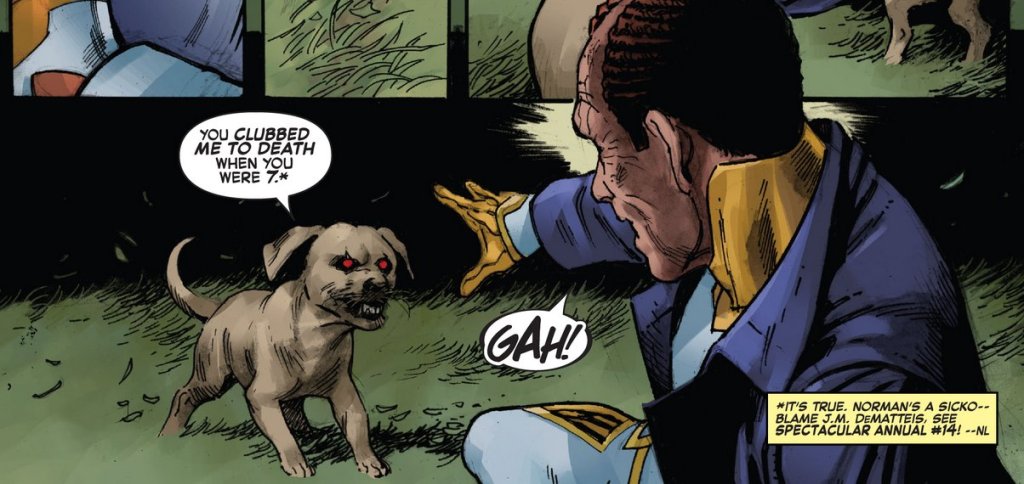 Norman meets the dog he killed in Spectacular Annual #14. That happens to be one of my very favourite Osborn Stories so I’m glad it’s still remembered!