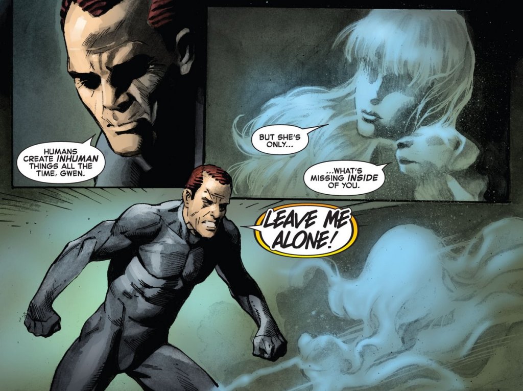 Norman shakes off Ashley, leaves a screaming voicemail for Peter about why he never mentioned that his sins were possessing someone else, vows to kill Queen Goblin, and encounters Ghost Gwen once more. I like the parts with Gwen very much, I much prefer this pissed-off, vaguely demonic being to Gwen as a saintly innocent angel yet again.