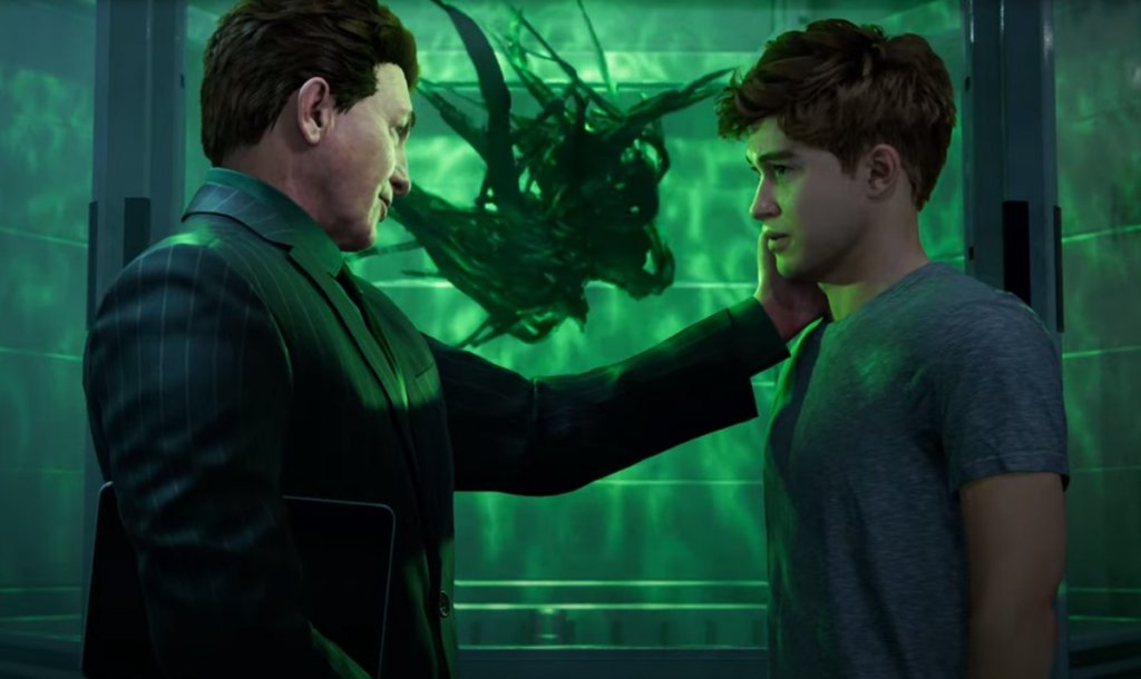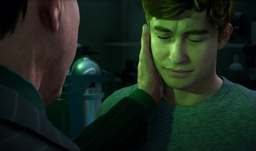 Here’s our very first look at Norman in this game! He and Harry stand in front of the green tank with the symbiote in it and Norman says “I’m not going to lose you.” Is Harry going back in that tank?