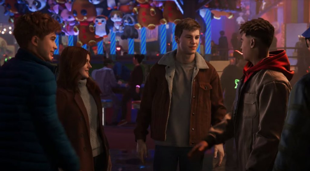 Later on, Harry, MJ, Miles and Peter meet up at a fair. This is the first time Miles and Harry have met!