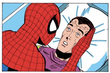 Then, a shot of Harry looking at something and a shot of Peter struggling inside the symbiote suit. They’re probably not the same scene, but we’re clearly meant to make a connection here!