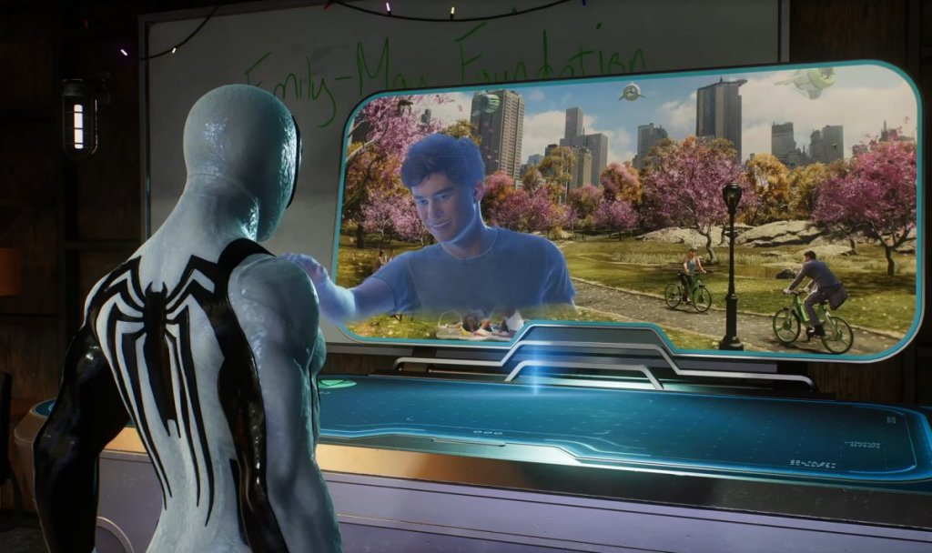 There’s another beautiful moment between Peter and (a pre-recorded hologram of) Harry during the post-game. Once you’ve completed all the EMF missions on the map, Norman leaves Peter a package with a note that says “Harry wanted you to have this.” Inside the package is a USB stick and snippets of the plants from Emily and May’s memorial garden. Once Peter’s fused the plants together and created new ones that will eventually cover the city’s green spaces, Harry’s hologram tells him that it’s to ensure Emily and May will live on “in the city, and of course, in us.” It’s terribly bittersweet. He then says, “I love you, Pete, I really do,” and gives Peter “one last thing” – a new suit, the Life Story suit (from the comic of the same name, of course), and signs off with, “Love ya.”