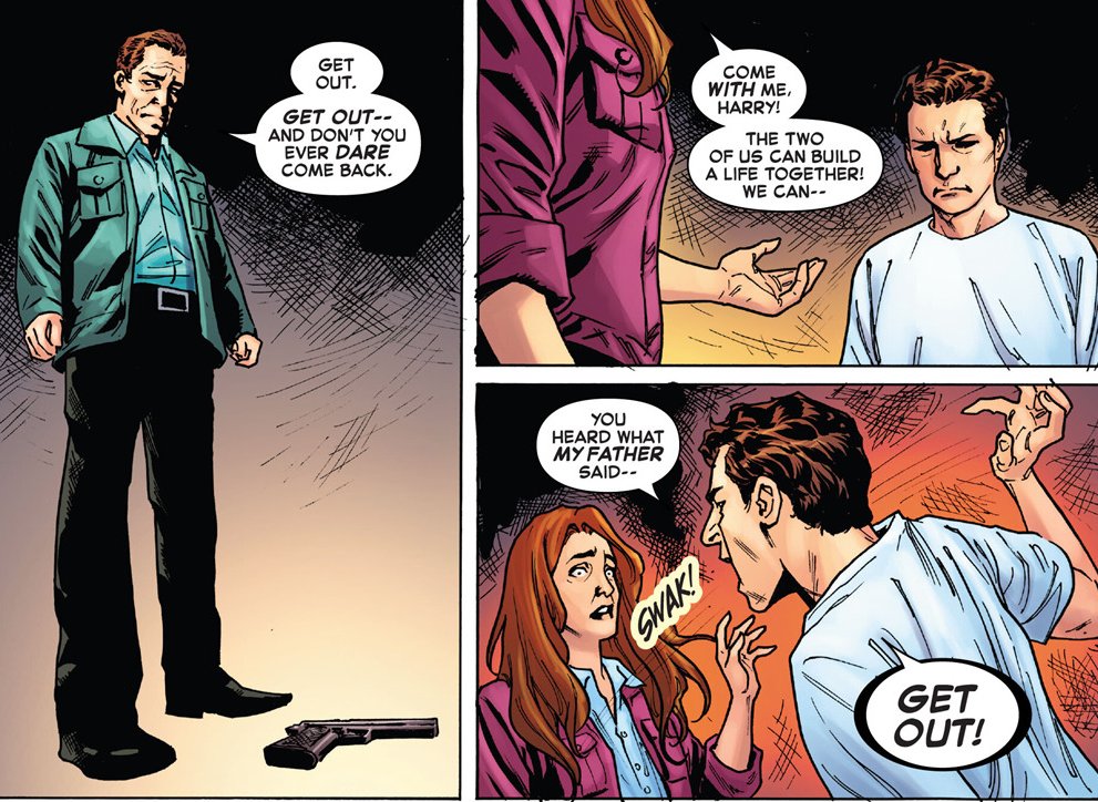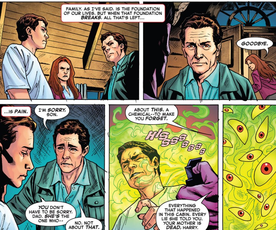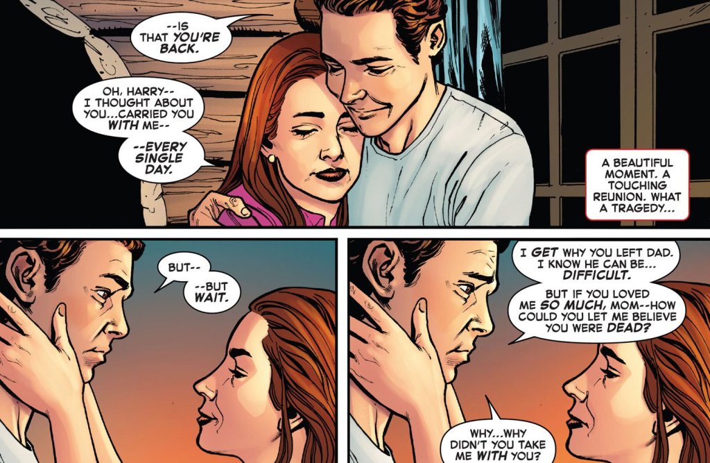 …but then things change. Harry is furious that his mother abandoned him. (This is the feeling he notably didn’t have when he first met Emily as an adult in Amazing Spider-Man #800.)