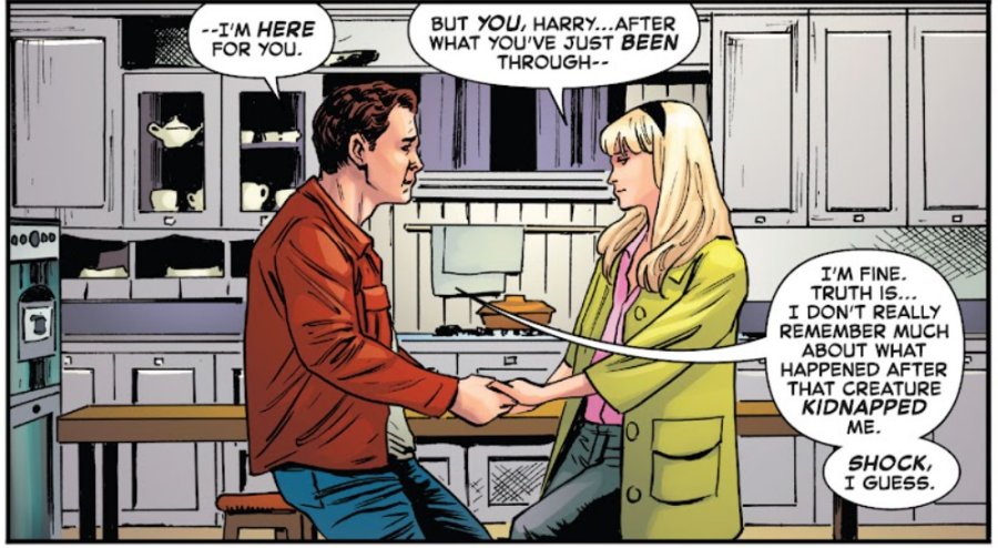 (this actually retcons the Gwen Stacy miniseries, where Harry and Gwen don’t meet until a little while after Helen Stacy’s death and they bond over dead moms. But oh well.)