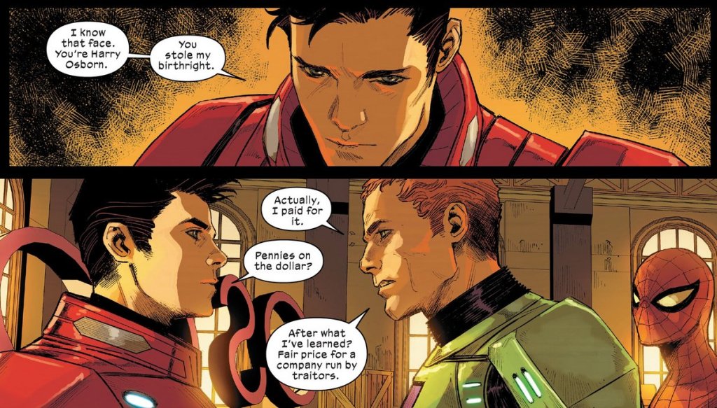 Tony is antagonistic towards Harry straight away. (Remember that Harry’s armor is Stark tech, artfully painted green.)