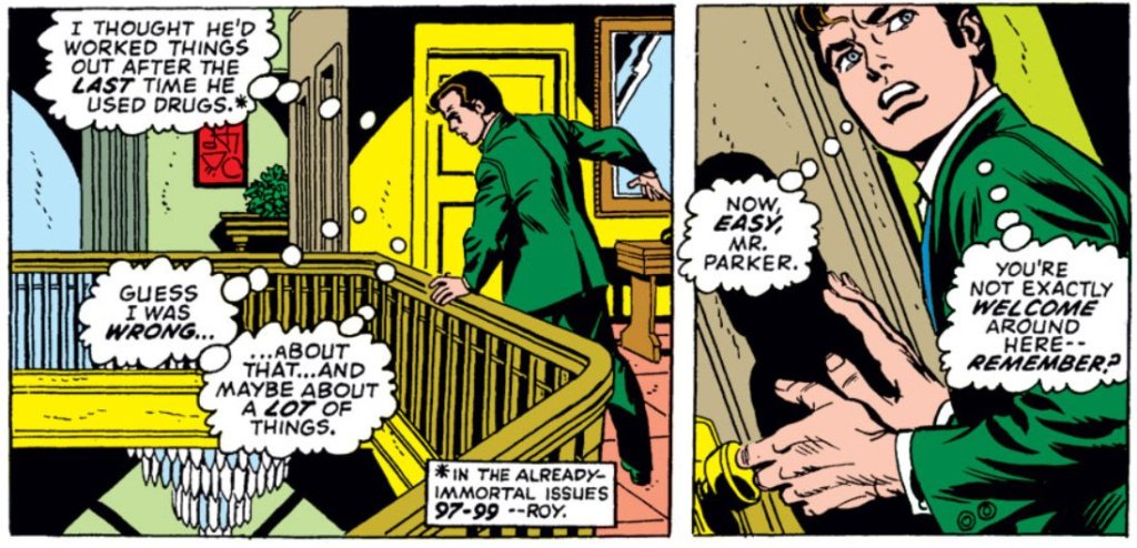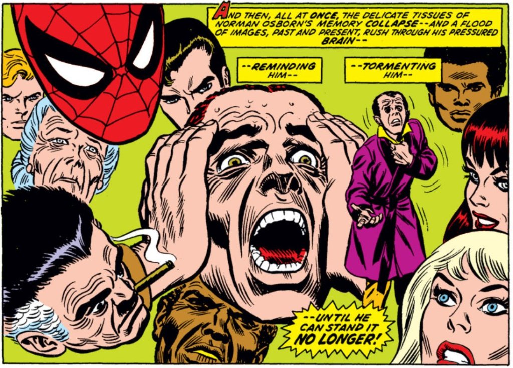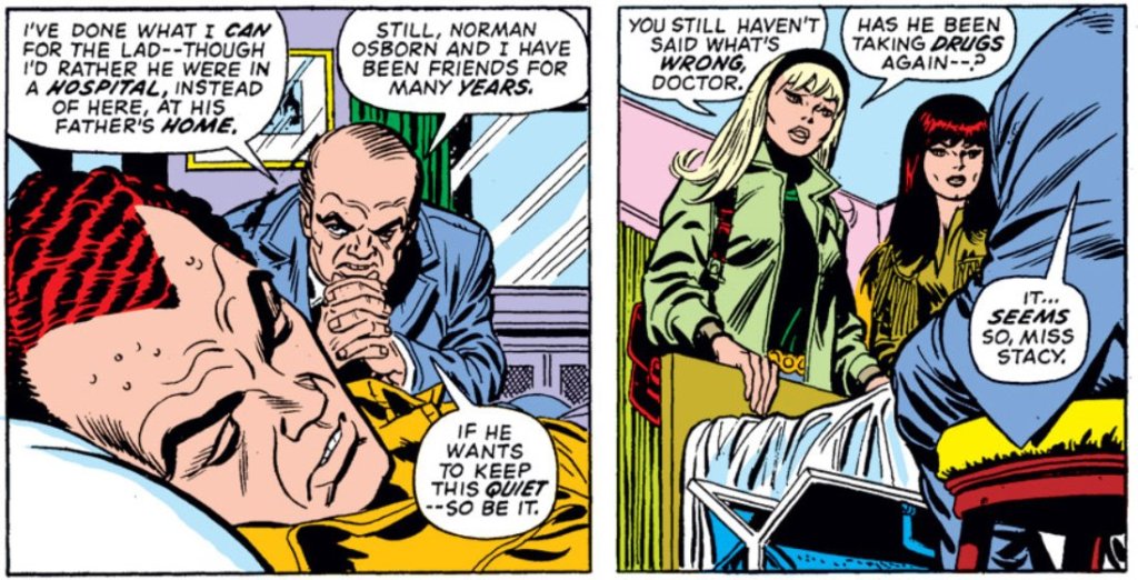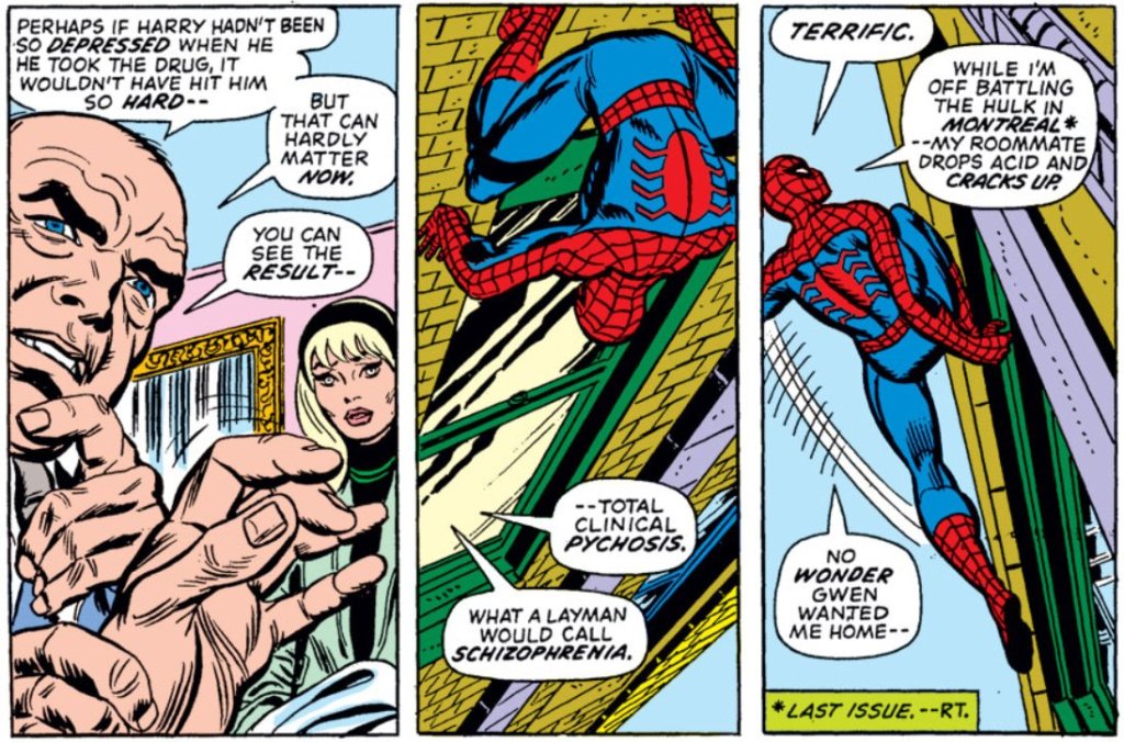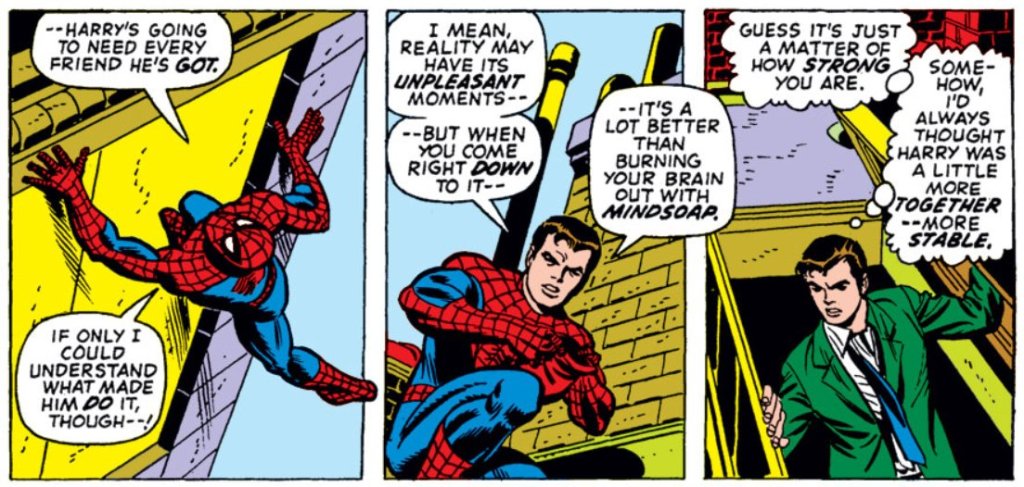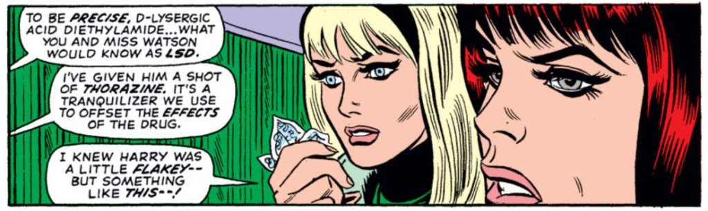 Peter is, rather sadly, not sympathetic to Harry’s plight. There is a link between LSD and schizophrenia, by the way. Though stress is another thing that can trigger it, and Harry has certainly been stressed. Later comics would make it clear that he’s carrying a lot of childhood trauma around, but as well as that he just went through the end of his relationship with MJ.