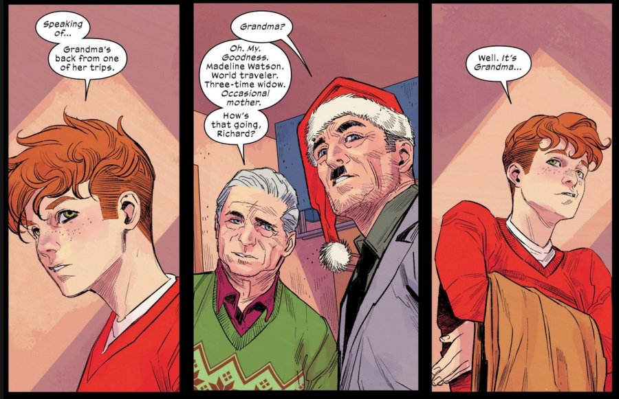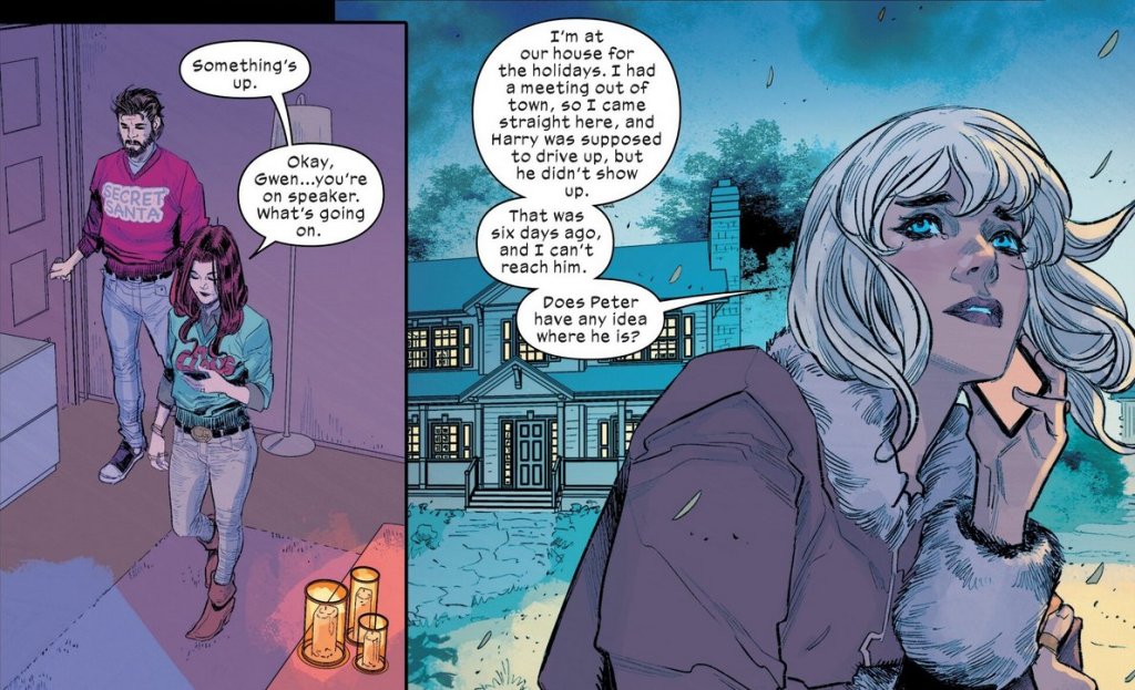 Keep an eye on Peter all throughout the Christmas celebrations. Something’s off about him. He doesn’t talk! People talk around him, not realizing he’s not saying a word. And Gwen keeps calling MJ, but MJ’s too busy to answer. Until finally…