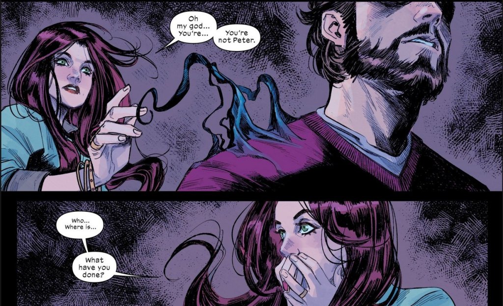 Peter has been replaced with his picotech suit, which can take human form. And the real Peter? MJ doesn’t know where he is, but we do: