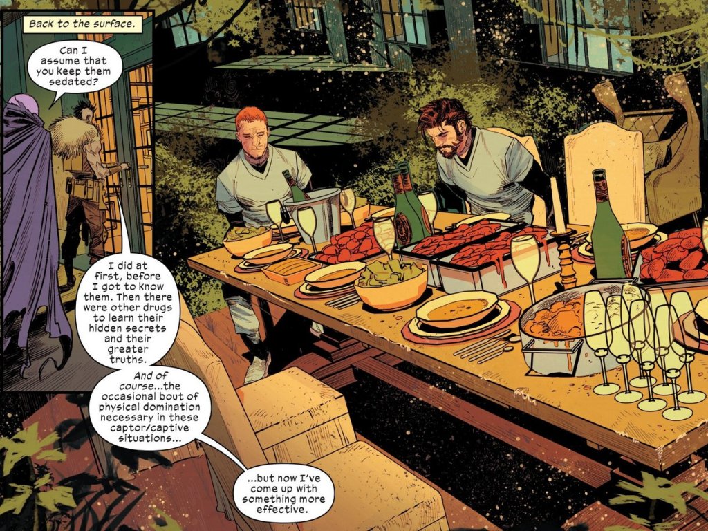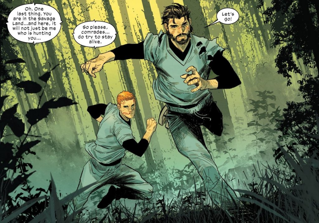 While Harry talks, Peter just sits, quietly seething. Then, Kraven hits a button and the men are shot into the savage land below.