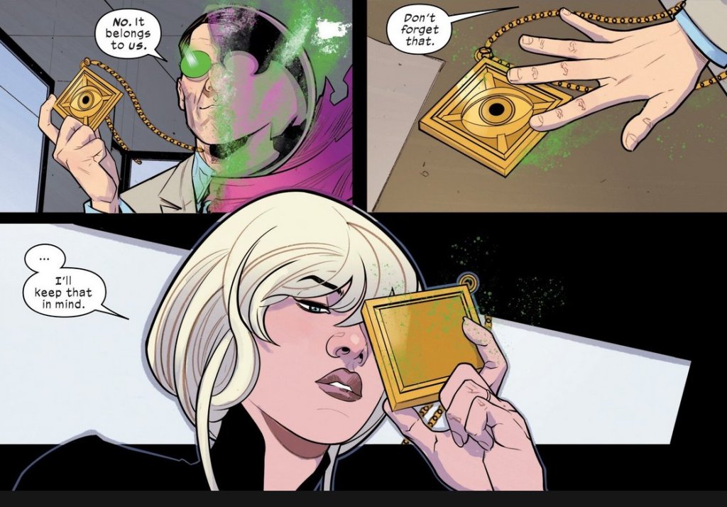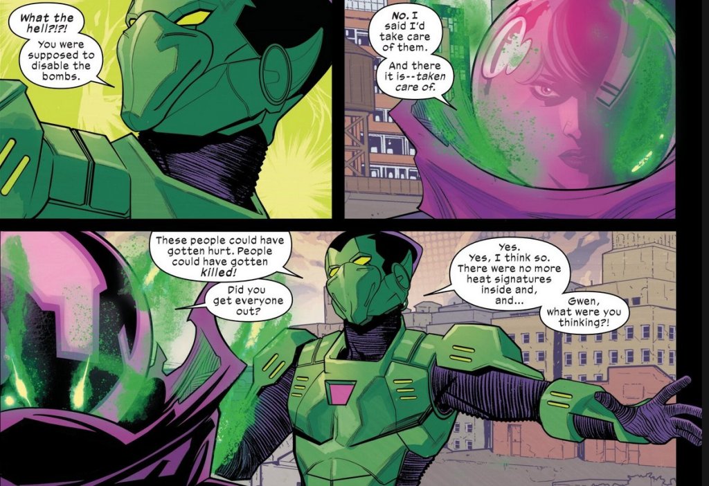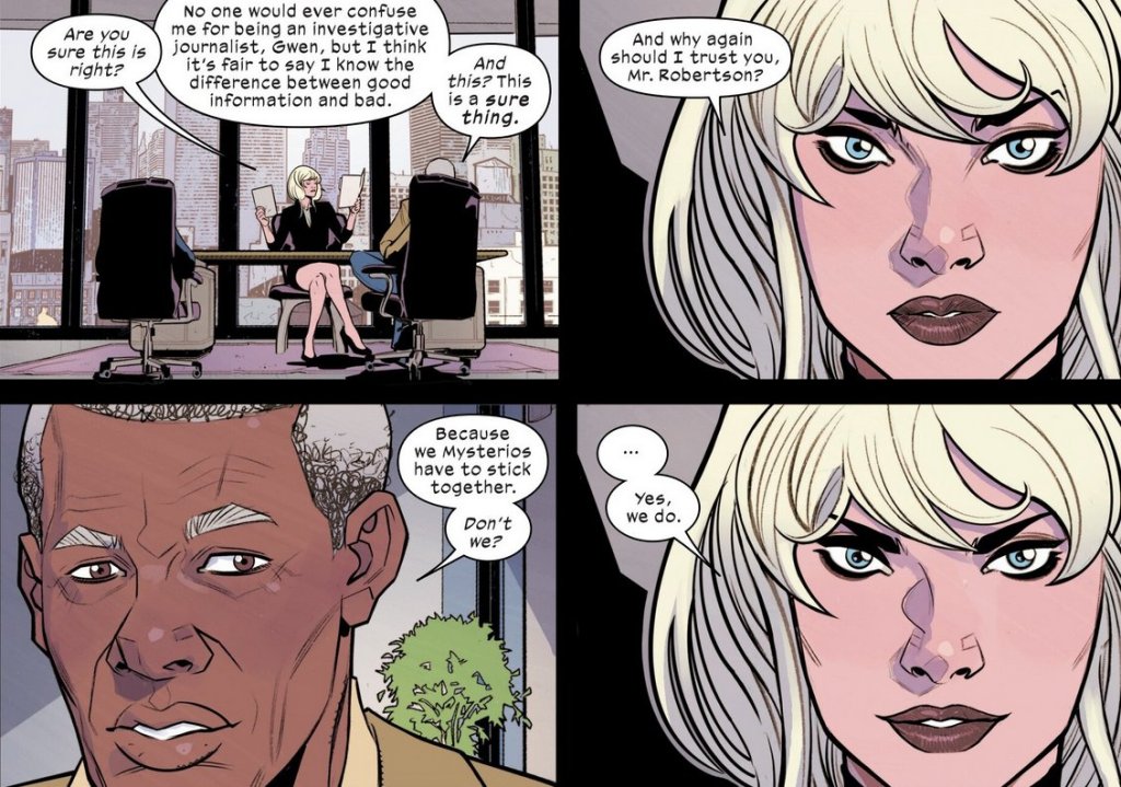 So! Where we left off, Harry had returned from the dead. Except, he wasn’t actually dead in the first place. Gwen, who is one of five people sharing the identity of Mysterio, made it look like he was dead. Now Harry and Gwensterio are going up the Sinister Six… but Gwen’s methods are slightly different than Harry’s.