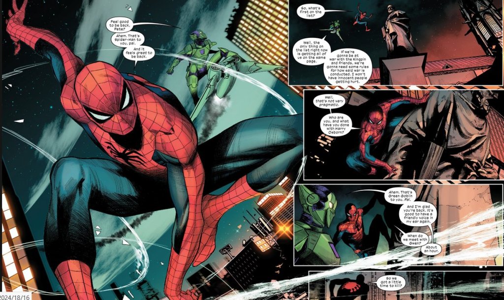 Harry was dead! Now he’s alive! Hooray! Oh, and Gwen is (a) Mysterio, and her methods of taking on the bad guys rather conflict with Harry’s and Peter’s. The stage is set for conflict! Let’s see what we got.