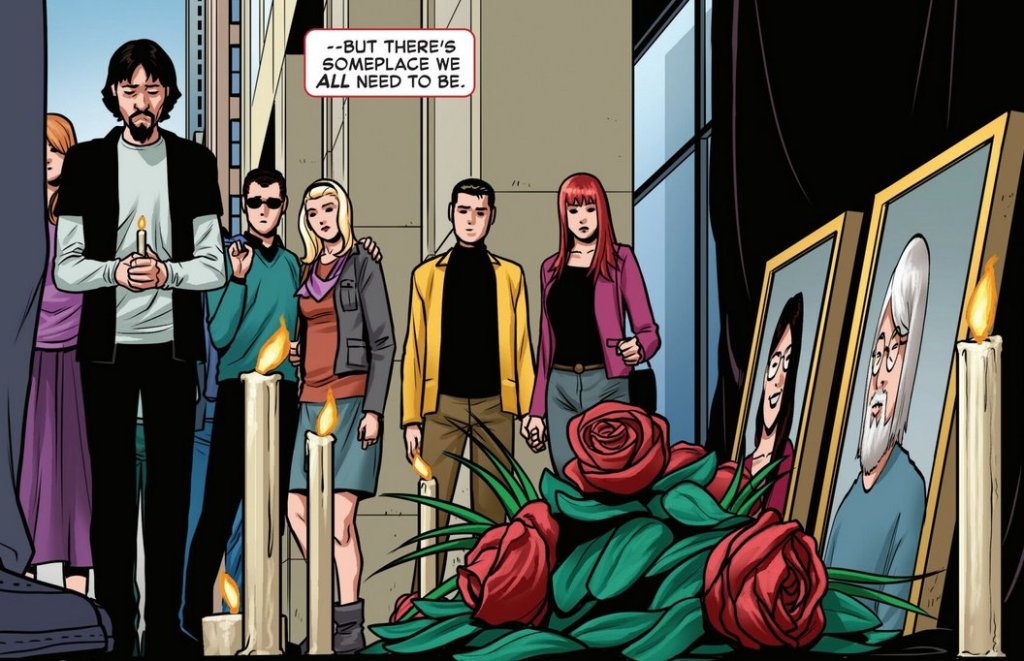 Peter attempts to crack the mysteries of the book, but he also takes time out to attend the memorial of the two murdered people. Harry, Gwen and MJ accompany him.