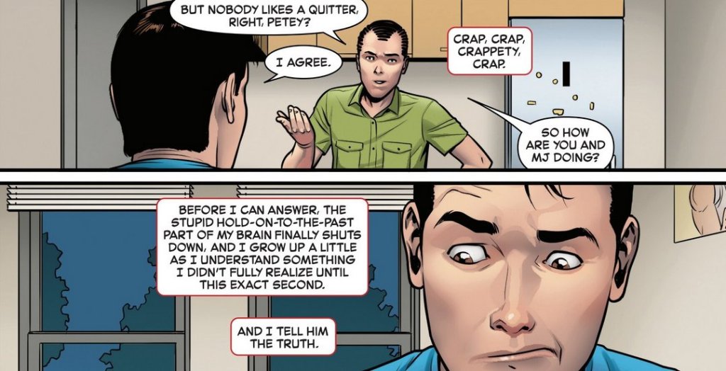 I’m as big a Peter/MJ shipper as anyone but the continuity is all off here. Peter didn’t love MJ until after Gwen died. And to say otherwise really takes away from the power of that one famous moment in The Night Gwen Stacy Died, where Peter insults MJ in his grief and she chooses to stay anyway.