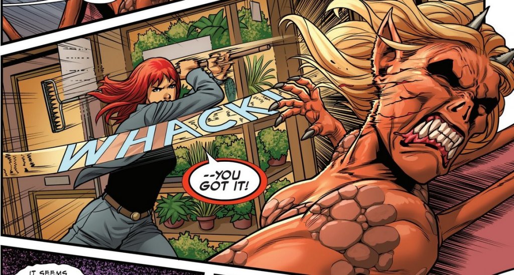 But it’s Peter and MJ who are the star couple here… in so much as Marvel will ever let them be, of course. Evangeline attacks Peter when he’s with MJ, looking for the magic (and very very evil) book. MJ gets some good hits in!