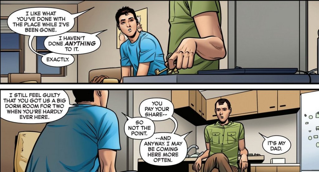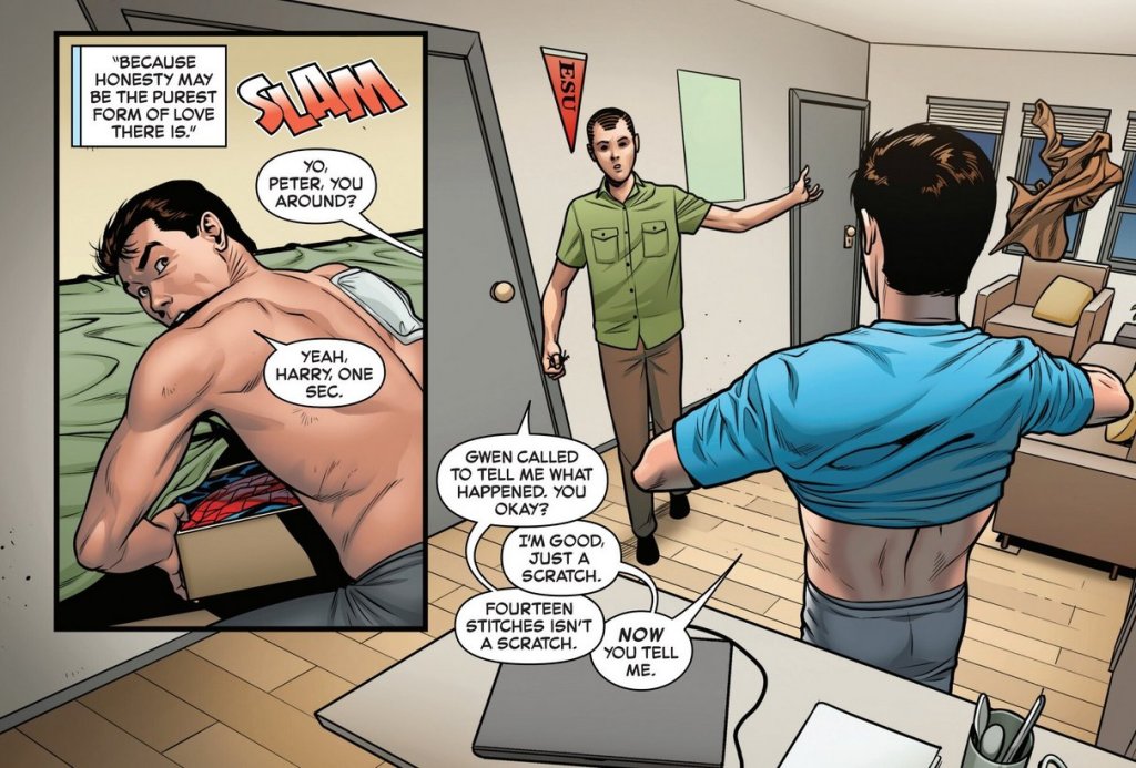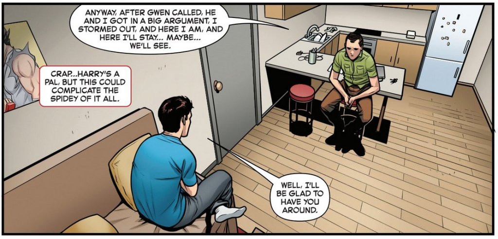 This all brings us to Torn #3, where we get a look at the Harry/Gwen relationship. After Peter’s beating at the hands of Evangeline (who refuses to pick a supervillain name) Peter returns home and finds Harry.