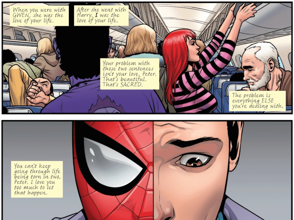 So as you no doubt know by now if you’ve read this comic, the ‘torn’ of the title refers in part to Peter being torn between Gwen and MJ, and MJ herself takes steps to remedy this. This comic is a FANTASTIC read for PeterMJ shippers (who have suffered much in the last few years) but what about us Harry fans?