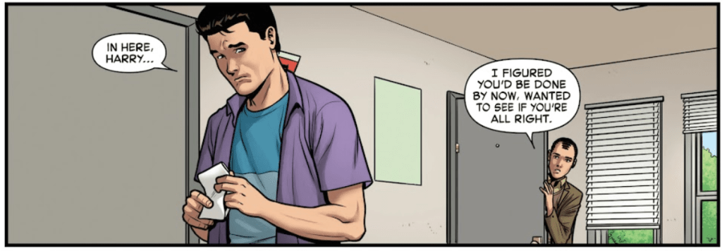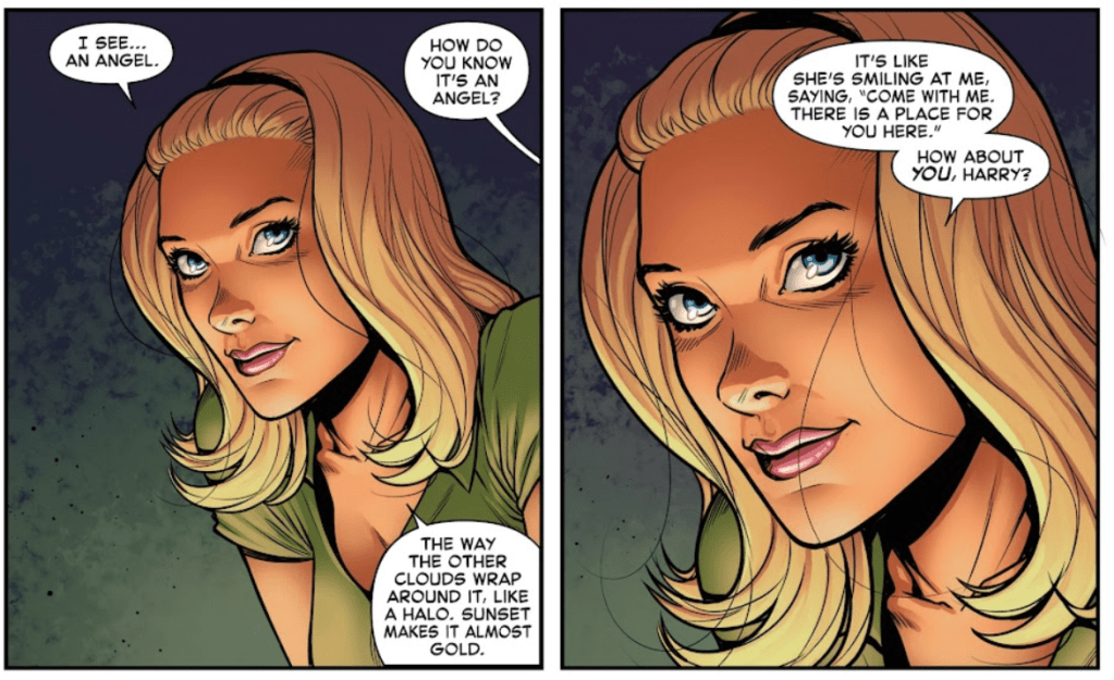This is such a sweet detail about kid Harry. Tell you what, he’s much more well adjusted in this comic than he usually is! But of course it was Gwen and his father’s death that pushed him over the edge.