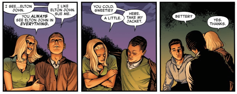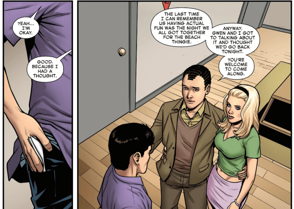 Needless to say, Peter gets into a funk over all this. So Harry essentially invites him to come along with him and Gwen on one of their dates.