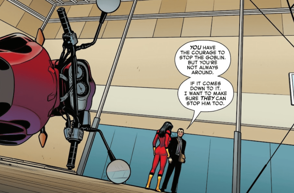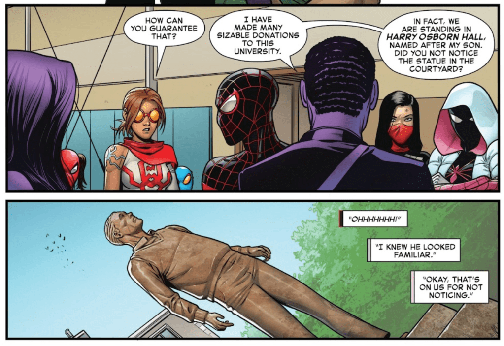 ….not in real life, of course. In The Amazing Spider-Man: Spider-Versity #1, Norman seems to be up to his old tricks, but no, he’s teaching Miles, Ghost-Spider and all the other Spiders how to fight effectively against a Goblin. Jessica Drew nearly kicks his ass, as she should, but then Norman reveals that he’s still totally good now, honest, and also…